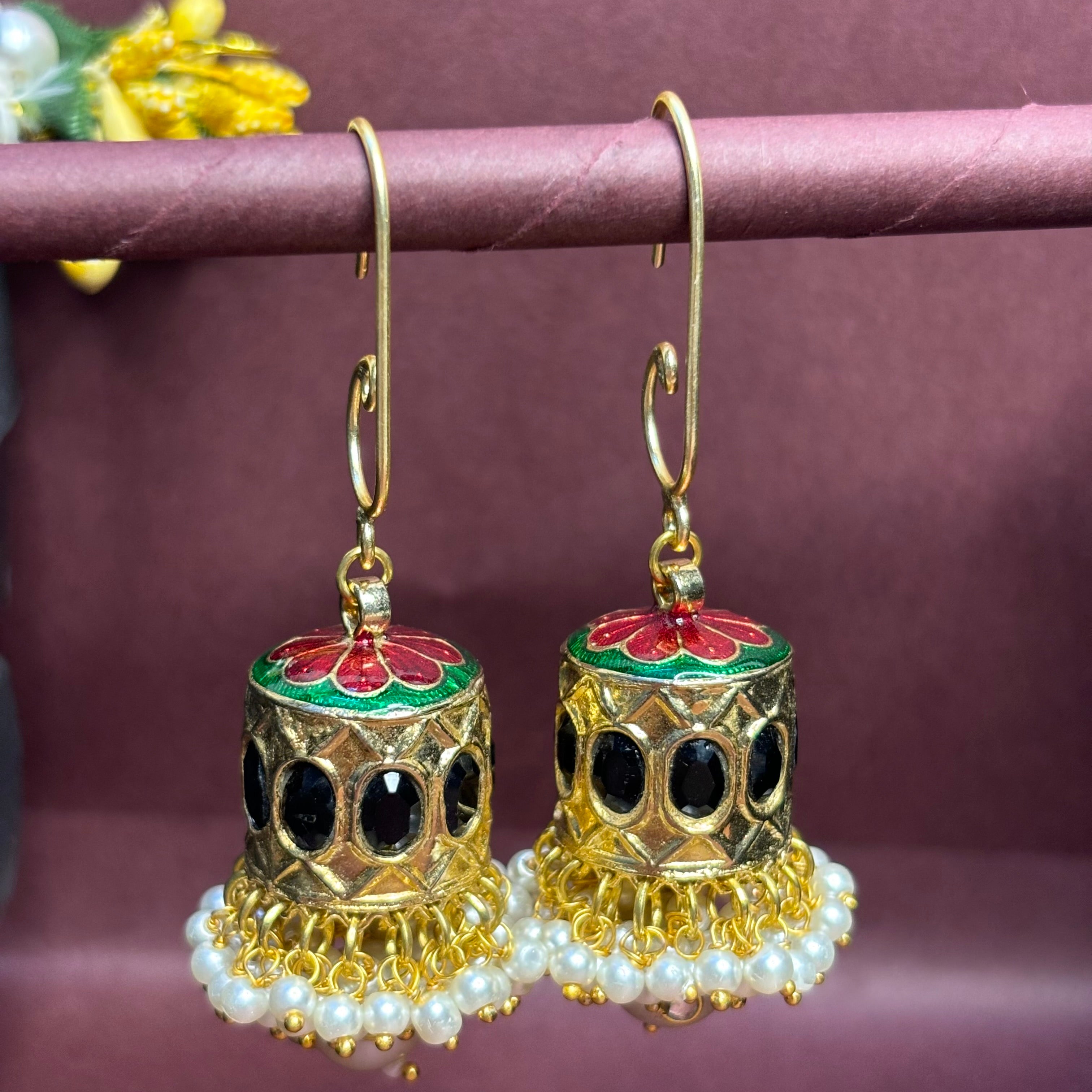Bloom with elegance! These Meenakari Bloom Jhumkas blend vibrant floral enamel with classic black stones and pearls, perfect for adding a pop of color to your traditional attire."