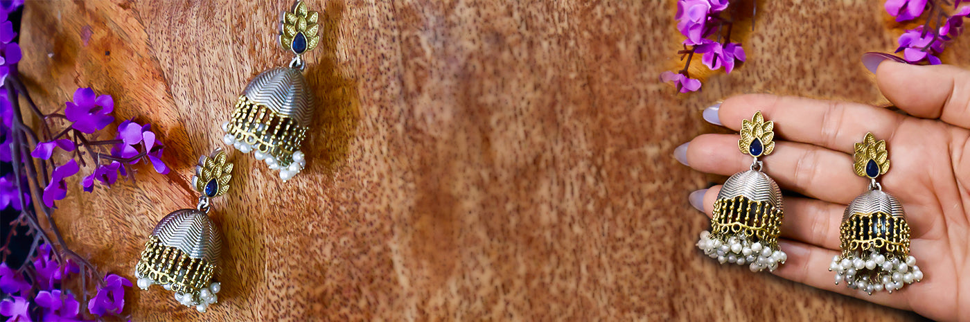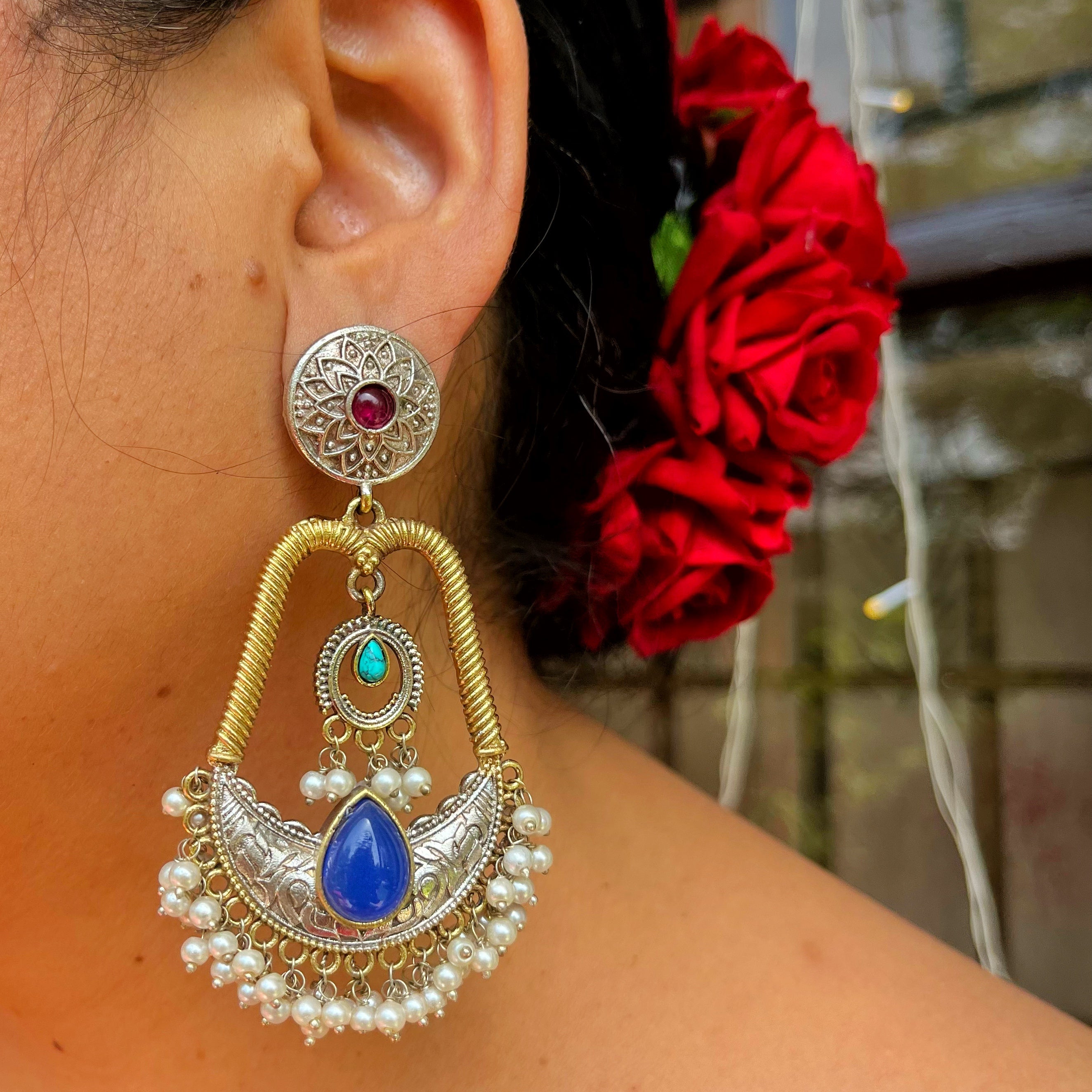 Upgrade your style with Bhairavi- Dual Tone Blue Stone Earrings. These elegant earrings feature a stunning blue stone that is complemented by a sleek dual tone design. Made from high-quality materials, these earrings are perfect for any occasion and will elevate your look with its unique touch.