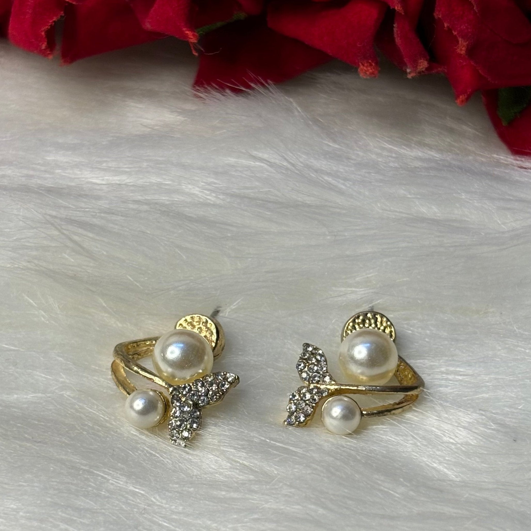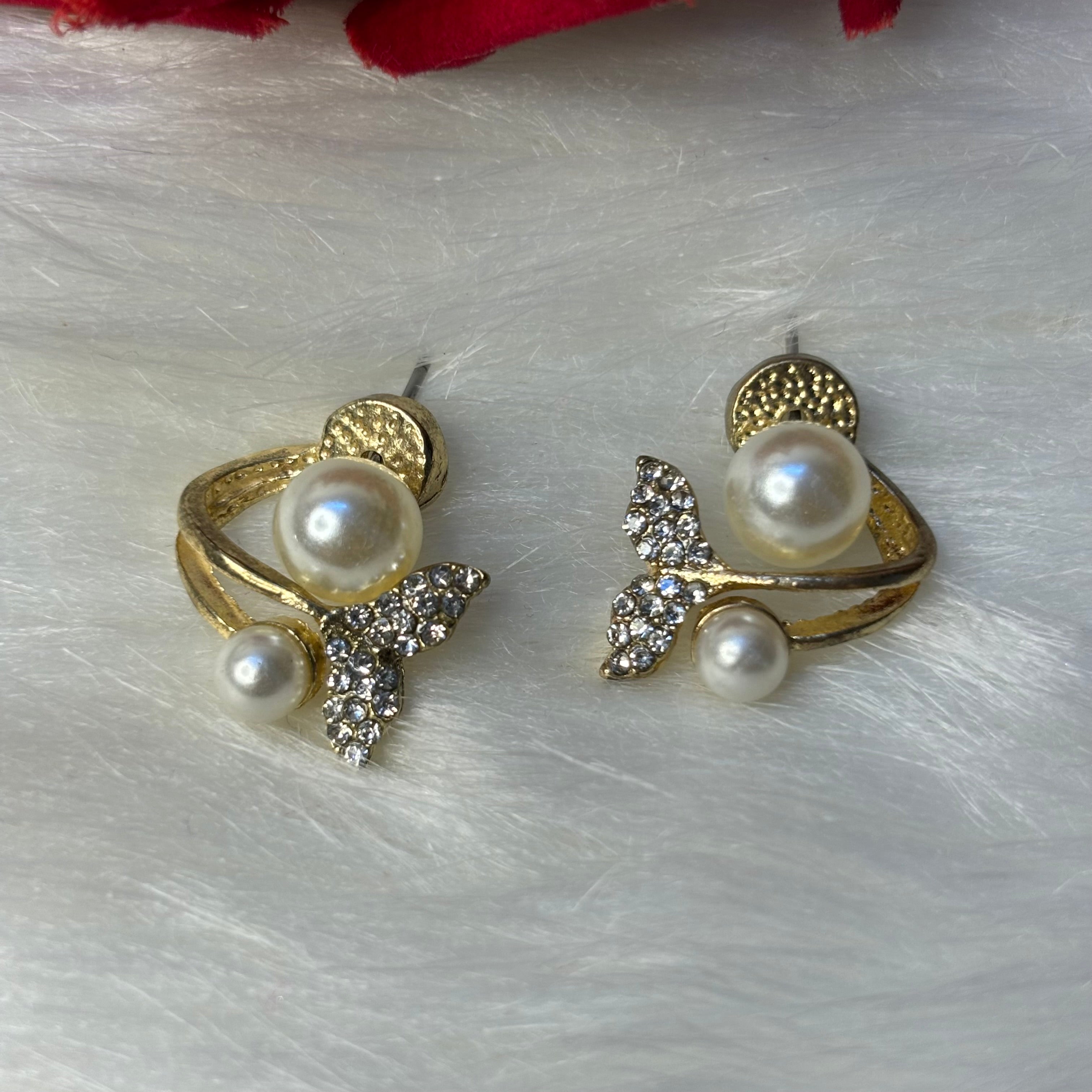 These earrings are an elegant blend of pearls and crystals, designed with a unique, curved shape that hugs the earlobe beautifully. The design features two lustrous pearls, one at the top and a smaller one at the bottom, connected by a graceful gold-tone curve. A cluster of sparkling crystals adds a touch of glamour, resembling leaves or a floral accent, enhancing the sophisticated look. These earrings are perfect for those who love a refined, modern twist on classic pearl jewelry, ideal for formal events or elevating everyday wear.