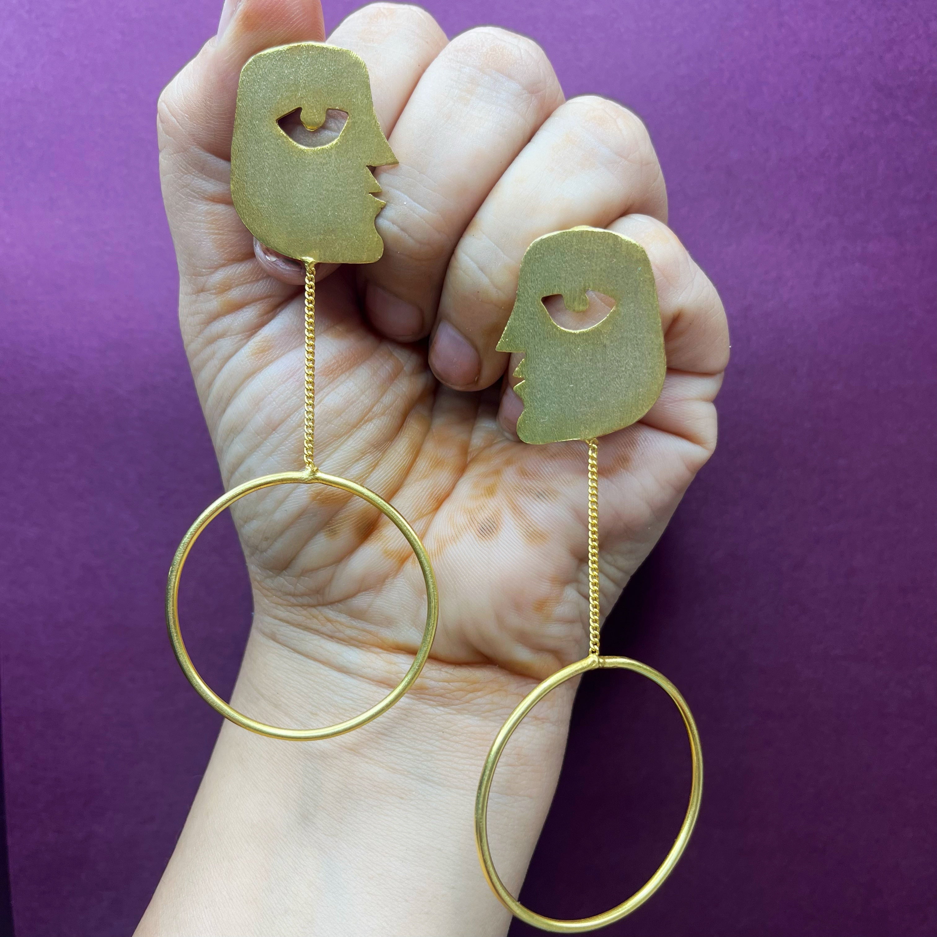 These stunning statement earrings are **handmade with brass**, featuring abstract face silhouettes connected to sleek hoops. The artistic design, combined with the warm gold tone, offers a modern yet timeless appeal, perfect for those who love unique accessories.