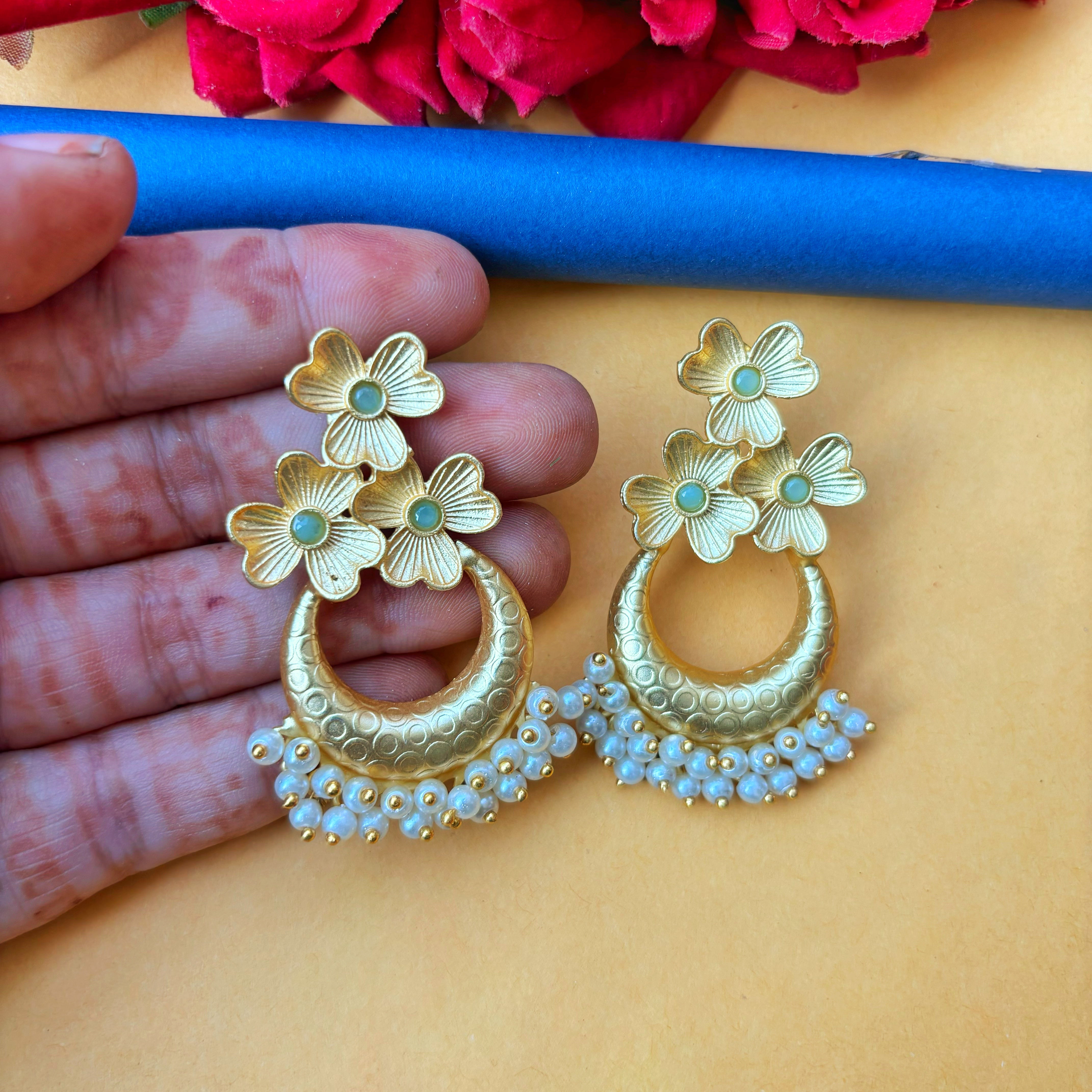 These earrings have a charming fusion of floral and traditional crescent motifs. The top features a cluster of three gold-toned flowers, each with a soft blue or green center, giving a delicate, organic look. Below, there’s a textured crescent shape with intricate circular patterns, reminiscent of a traditional crescent moon design. At the bottom, a row of light blue beads with tiny gold detailing adds a touch of elegance and movement.