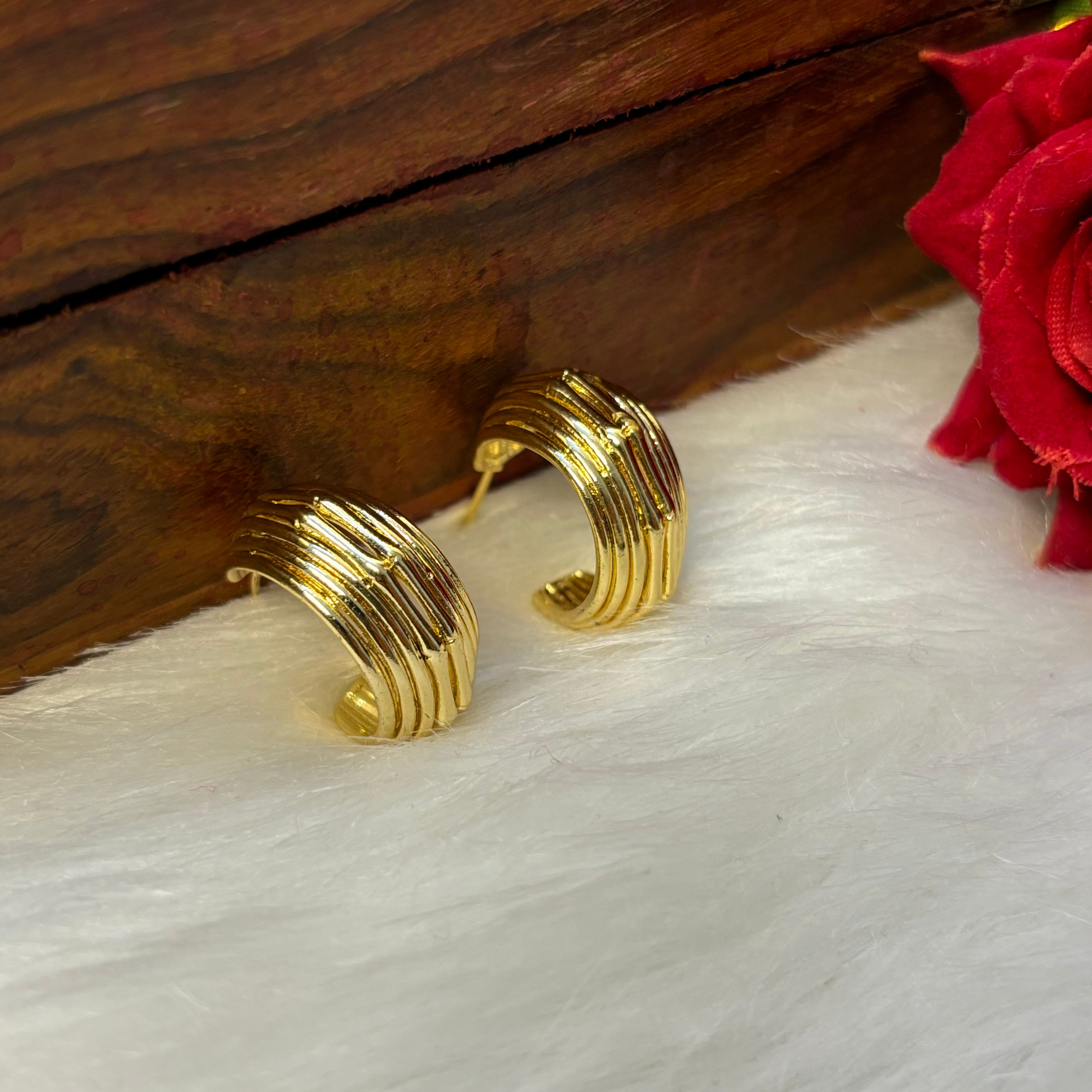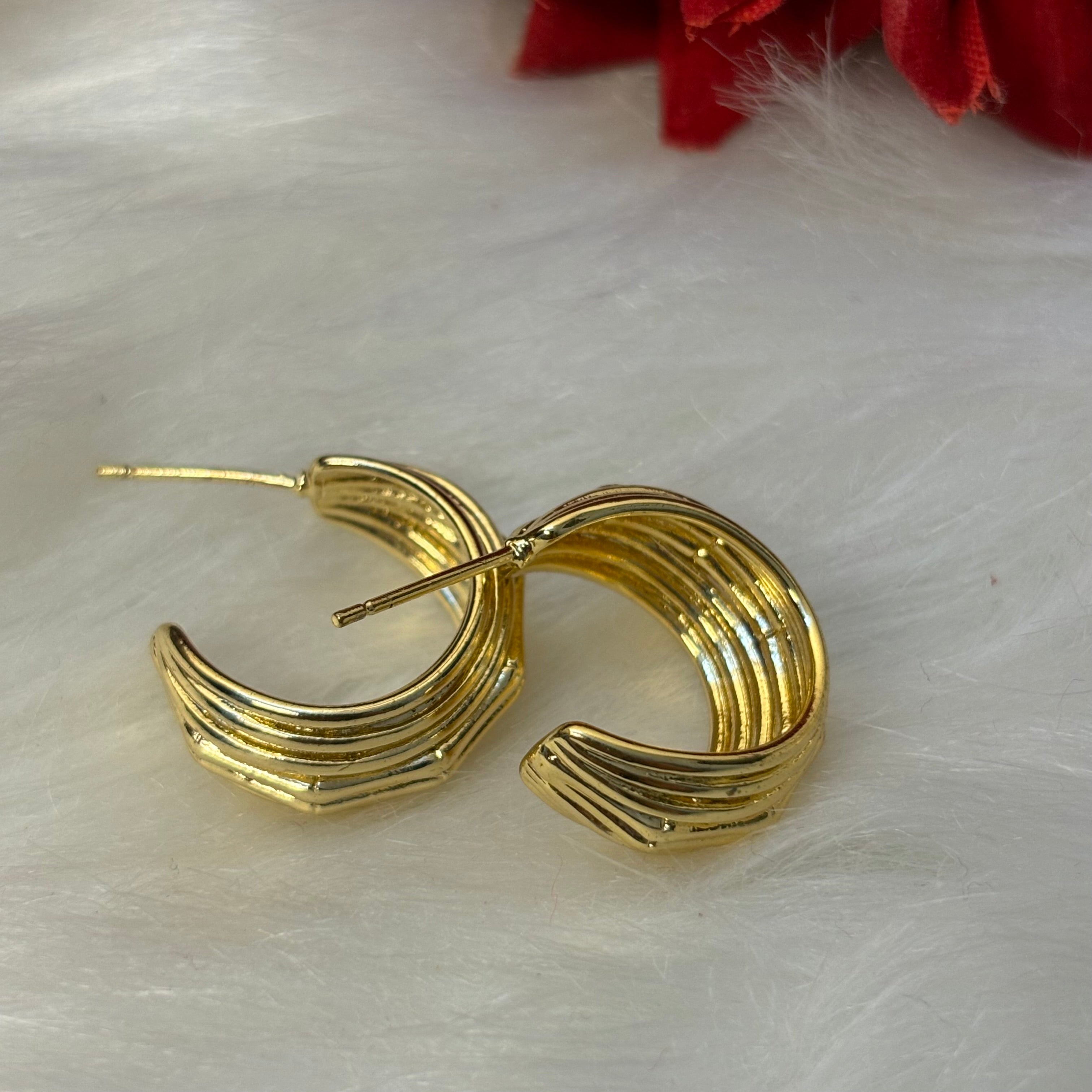 These anti tarnish gold-toned earrings feature a bold, geometric design with a multi-layered curved structure. The unique ridged pattern adds texture and dimension, making them an eye-catching statement piece.