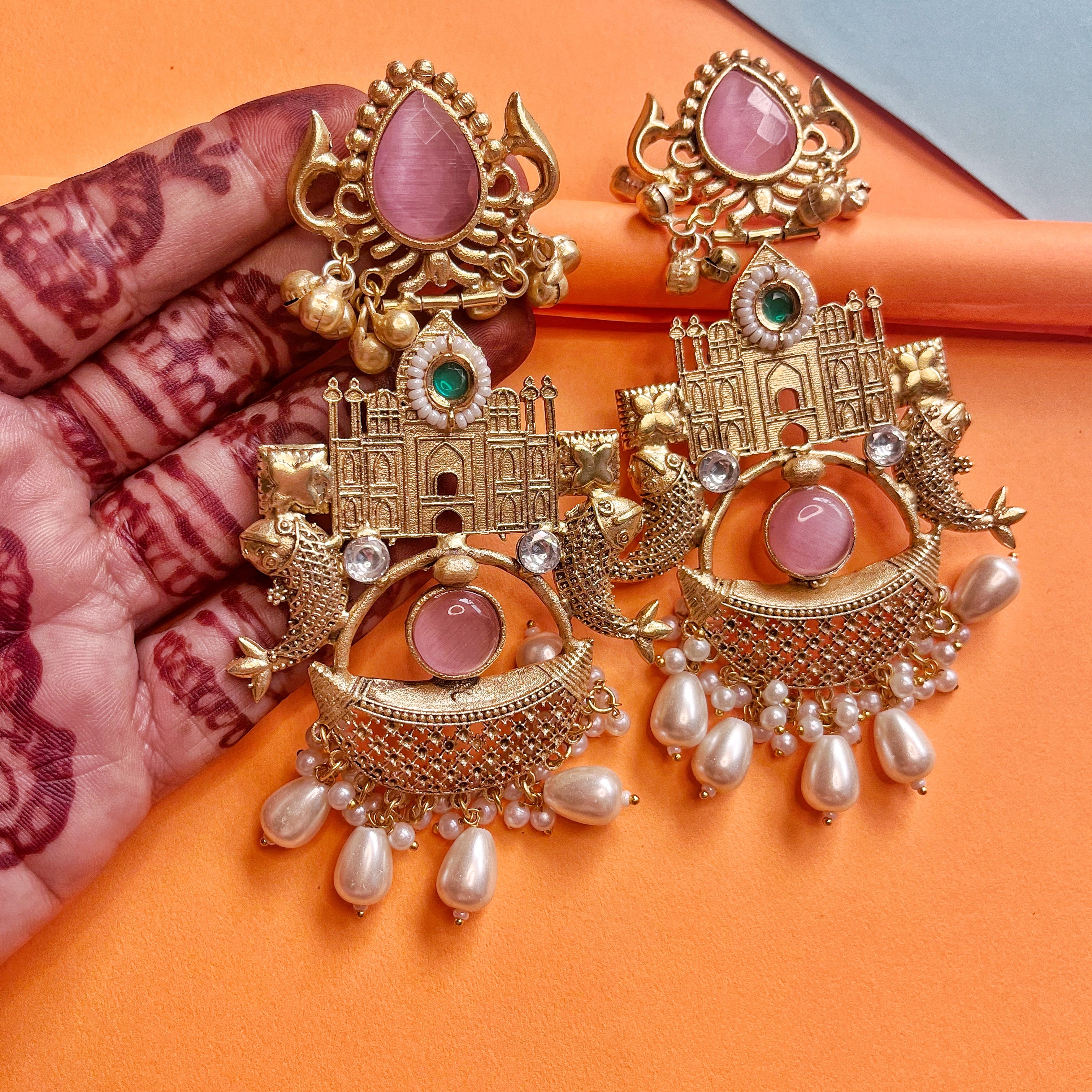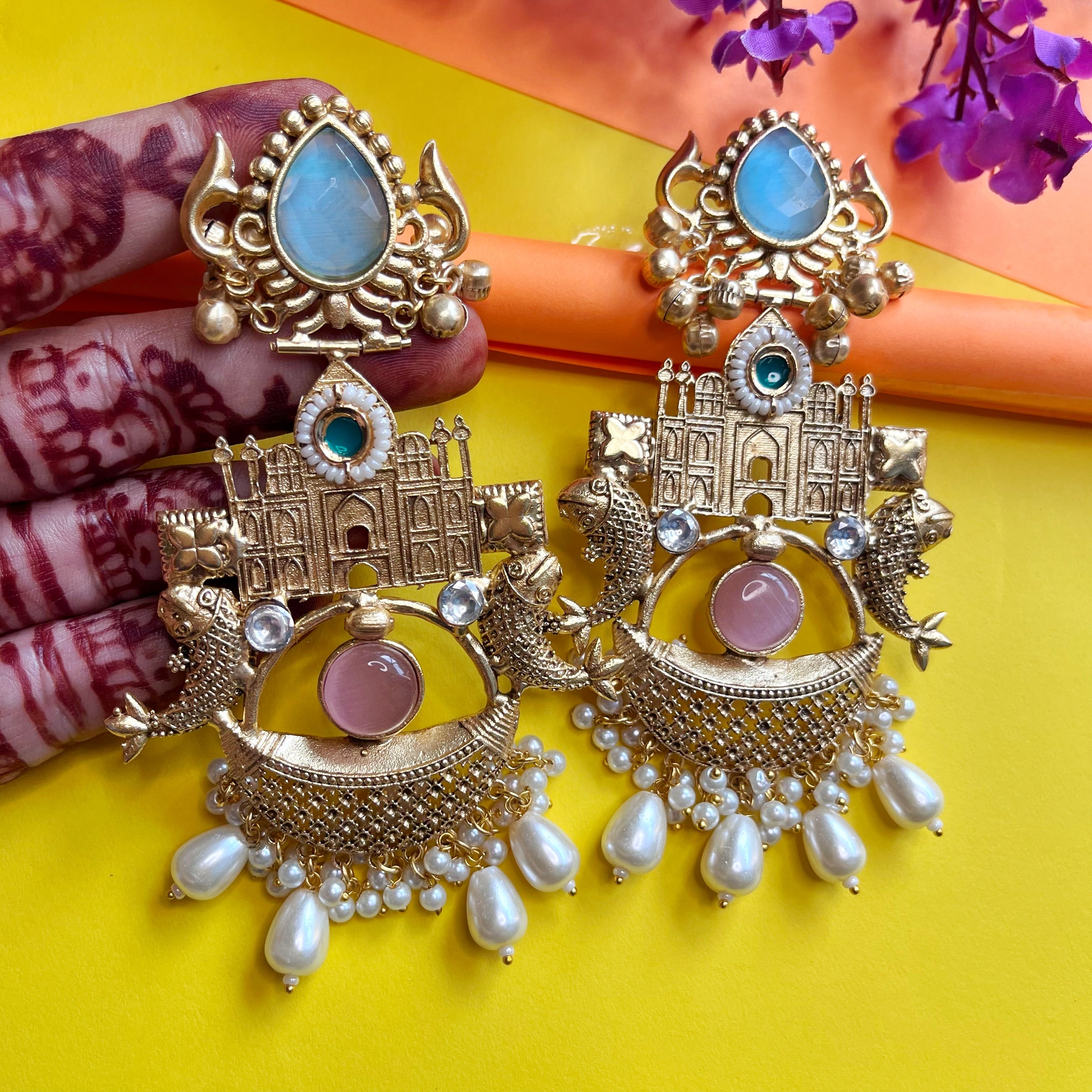 Introducing our Palatial Heritage Statement Earrings, a stunning blend of traditional craftsmanship and timeless elegance. These intricately designed earrings feature a regal palace motif, flanked by two beautifully detailed fish—symbolizing prosperity. The top showcases a pear-shaped pink stone set in a gold floral design, while a crescent moon cradles a central pink gemstone.