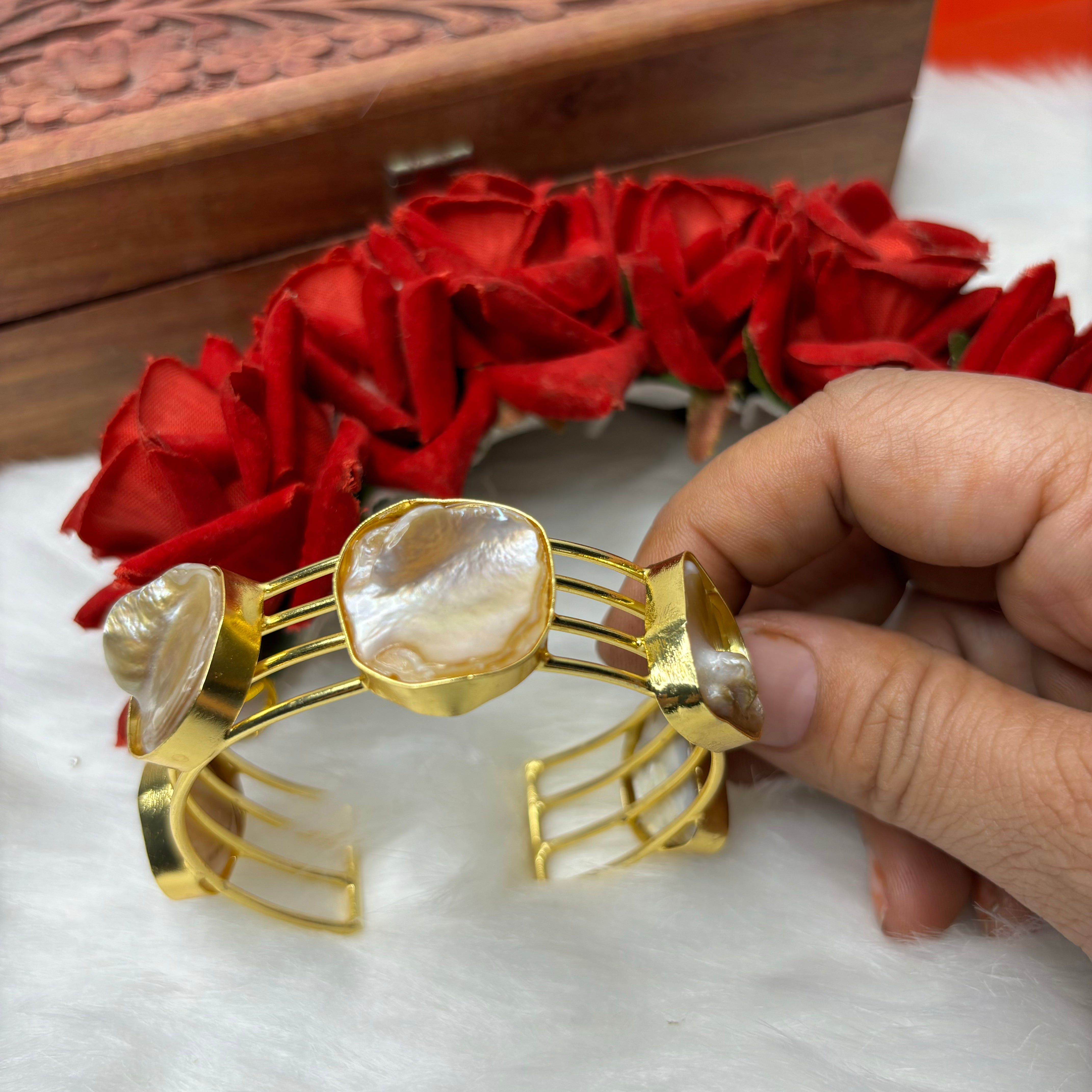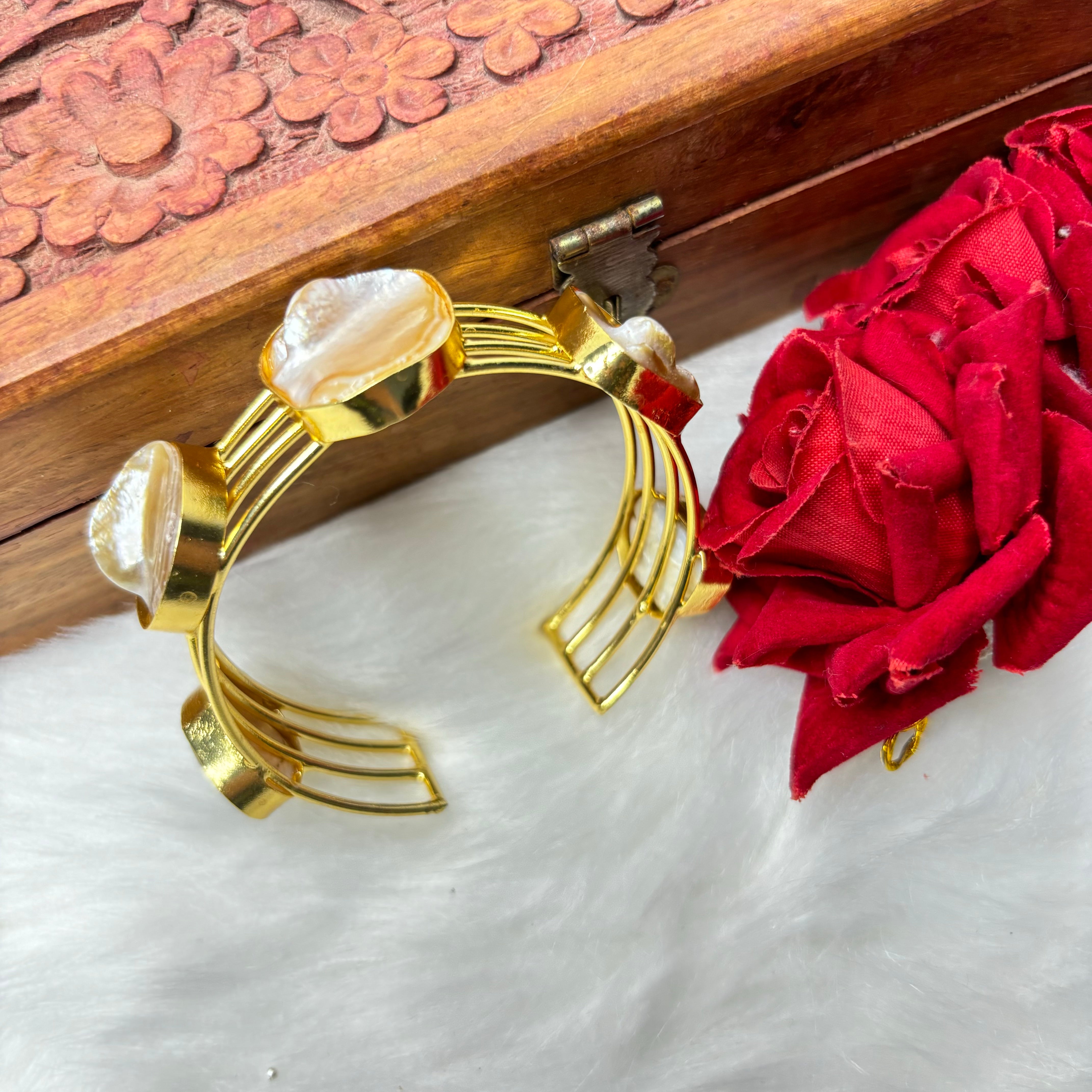 Golden-toned & off-white cuff bracelet, has white stone details with slip-on closure