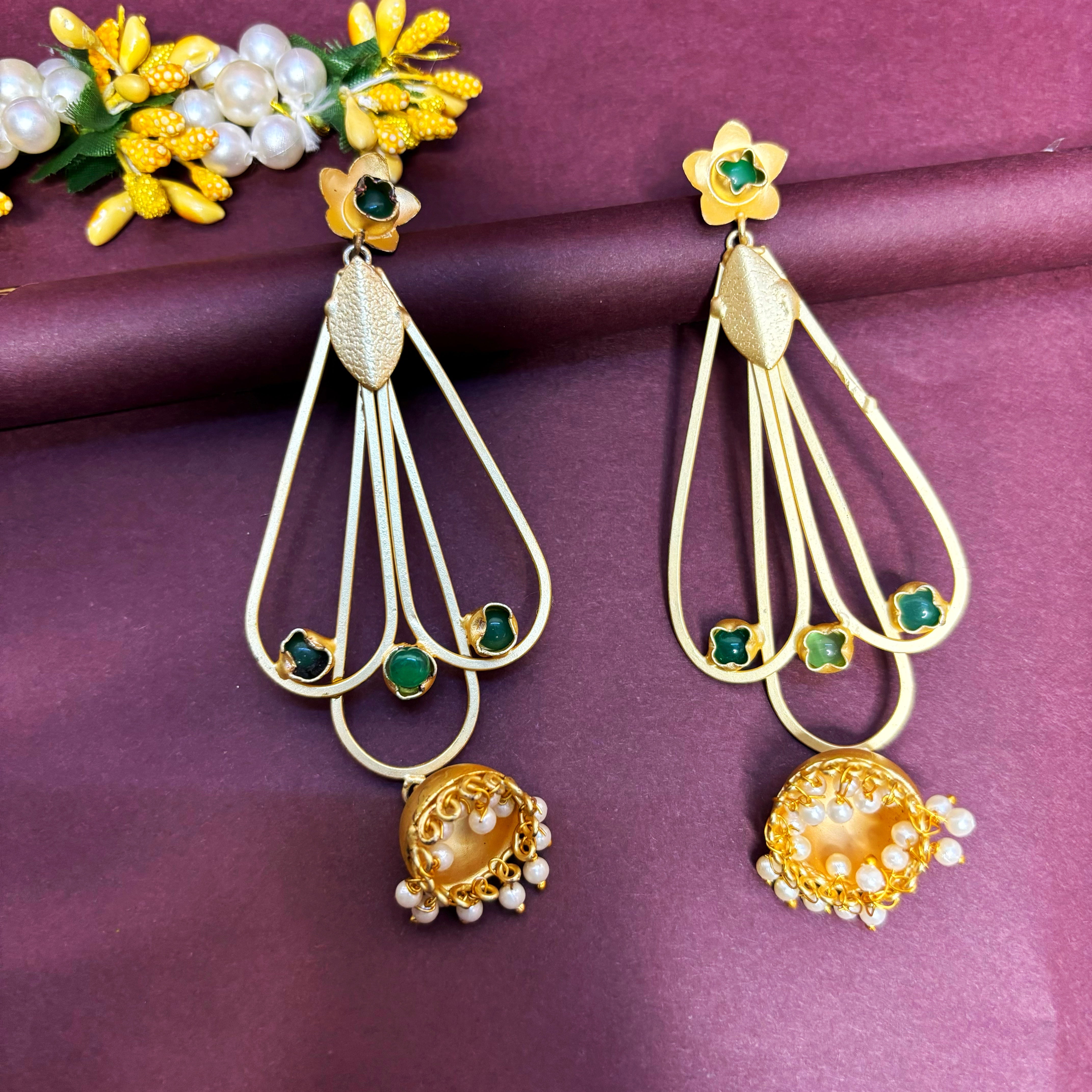 These earrings feature an elegant design with a structured, elongated floral-inspired framework in a matte gold finish. The floral details include green accents and a jhumka drop with small pearls, adding a traditional touch. The combination of clean lines and the jhumka motif makes these earrings versatile and striking.