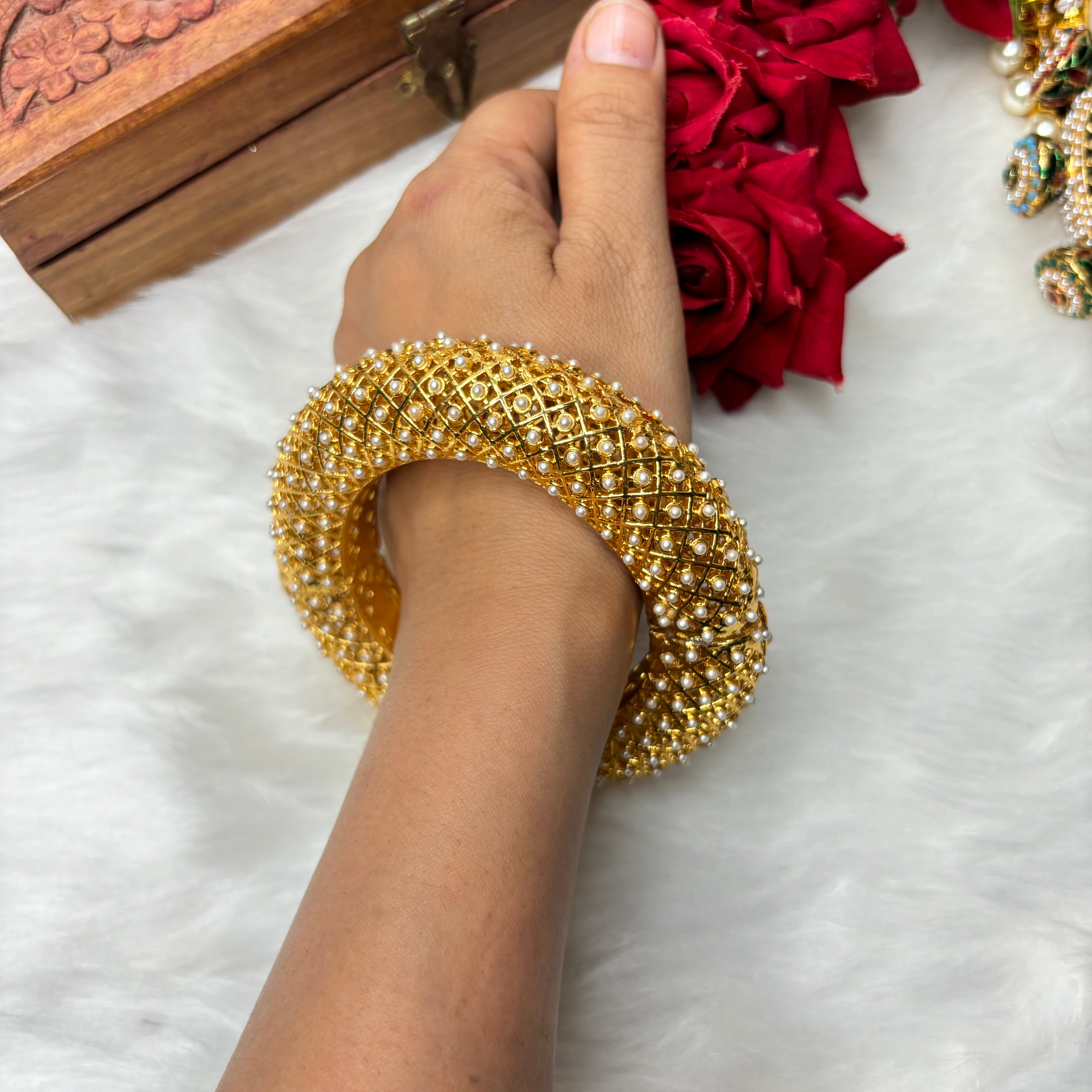 This golden peral studden jaal kadaa can be styled with your traditional as well as indo western outfits. The Aarna pearl bracelet is elegantly crafted using traditional jadau techniques. Adorned with pearls, this bracelet is adjustable and universally sized.
