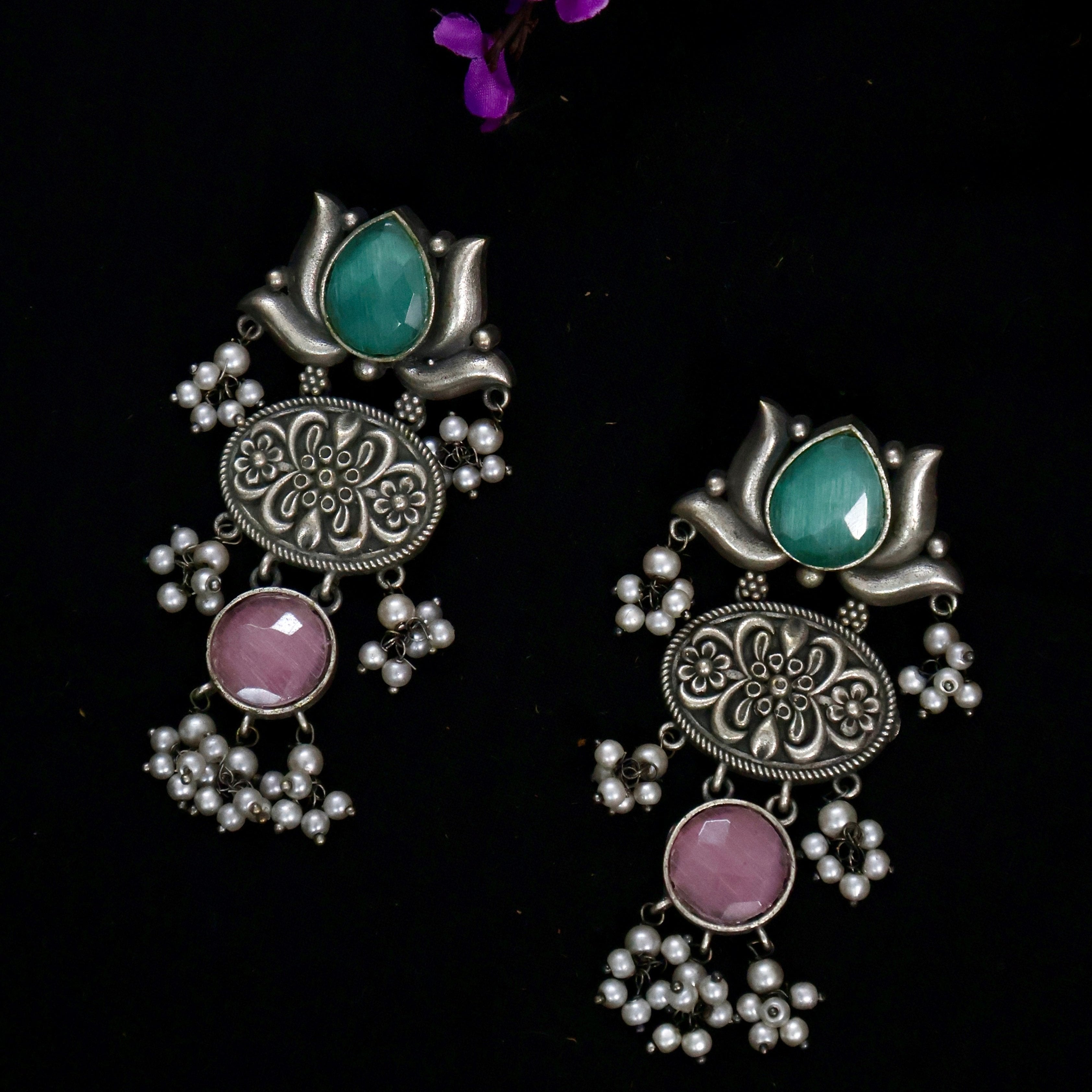 These Padma Oxidized Earrings feature stunning mint and pink Monalisa stones, adding a touch of natural beauty to your look. The lotus design symbolizes purity and enlightenment, making these earrings both stylish and meaningful. Expertly crafted and lightweight, they are perfect for everyday wear.