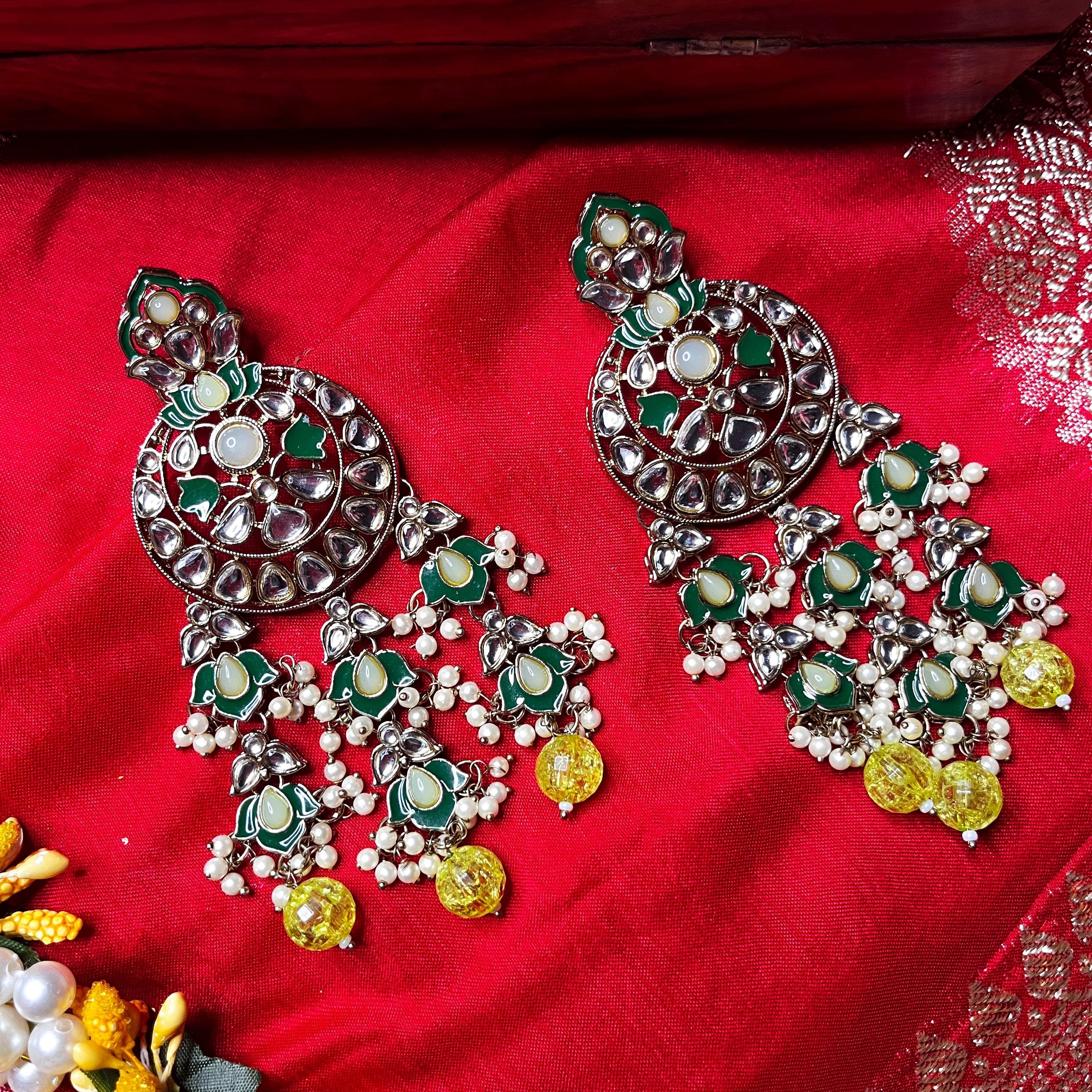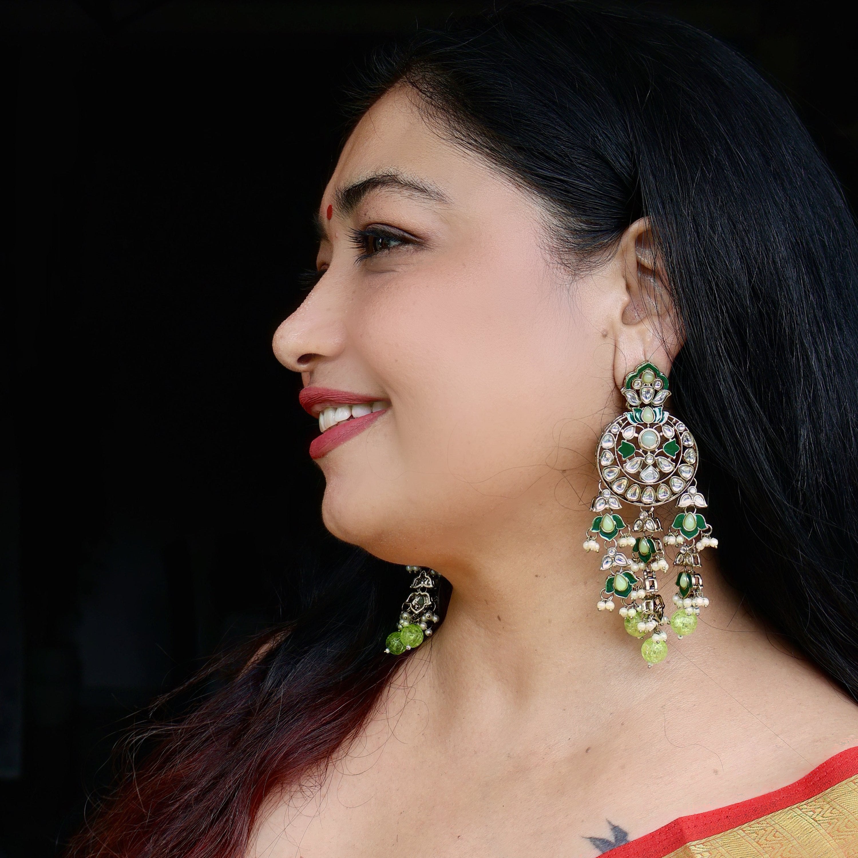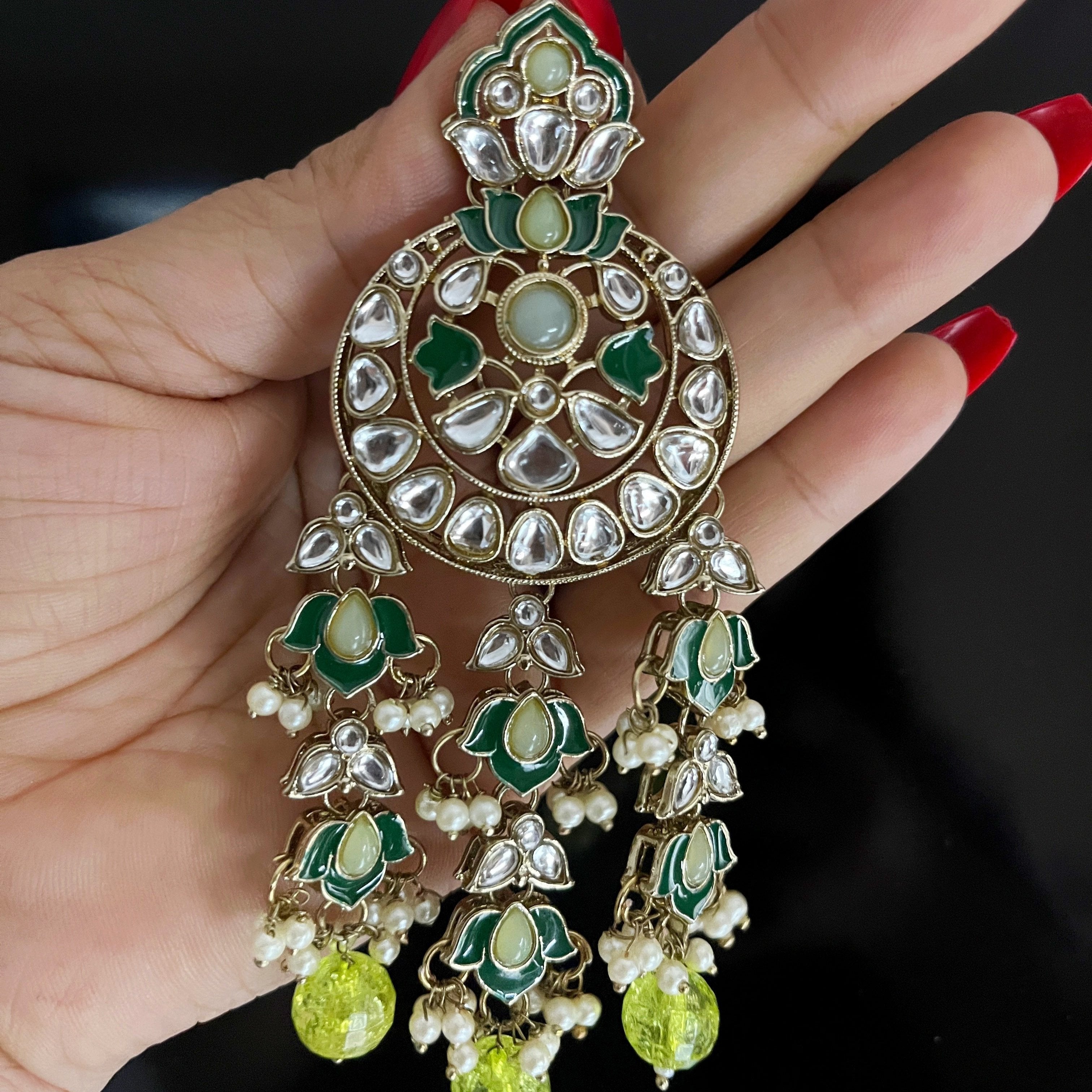 Experience elegance with our Kamli: Green Kundan Long Earrings. These earrings feature beautiful green Kundan stones, adding a touch of glamour to any outfit. Handcrafted with precision, these earrings are a must-have for any jewelry collection. Elevate your style and make a statement with Kamli.